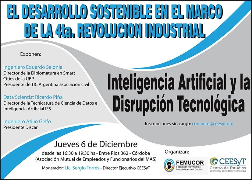 Desde el CEESYT tenemos el agrado de invitarlos a participar de esta nueva jornada donde conversaremos e intercambiaremos información sobre La Inteligencia Artificial y la Disrupción Tecnológica.La misma se da en el marco de la serie de eventos que venimos organizando desde el año 2017 en el ámbito de la problemática del Desarrollo Sostenible y que continuaremos el año próximo.